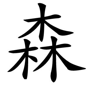 (3) 又如:森标(树丛的顶端);森木(高耸繁茂的树木);森沉(林木繁茂幽深);森阴(林木幽深繁密);森萃(茂密);森朗(繁密而又清朗)